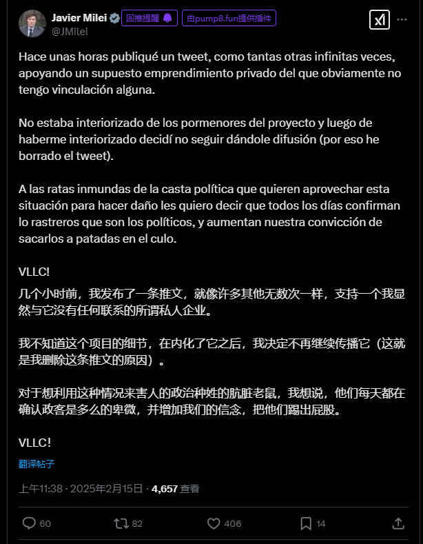2025年2月15日,阿根廷总统哈维尔·米莱(Javier Milei)通过其官方社交媒体账号宣布推出名为LIBRA的Meme币,声称此举将“促进阿根廷经济增长”,并公布了代币合约地址。然而,这一事件迅速引发了市场的剧烈波动,LIBRA币价格在短时间内经历了从暴涨到暴跌的过程,市值从接近50亿美元缩水至不到10亿美元。这一事件不仅引发了市场的广泛关注,也暴露了加密货币市场在名人背书和监管缺失背景下的巨大风险。