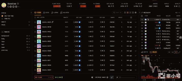 价格从低到高依次列出,右方展示实时的交易以及成交价格的分布。这样方便交易的 UI 设计加之空投预期,大量的资金开始冲入 Blur。此前很多 NFT 交易平台依靠代币短期吸引了流量,但 OpenSea 在交易额上的市场占有率并未在月度或者季度的数据上被挑战,但 Blur 的出现,使得直到一周前 OpenSea 在交易额上的占比重回 50% 以上。