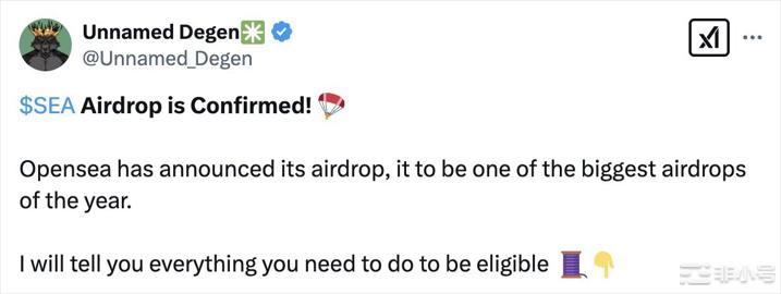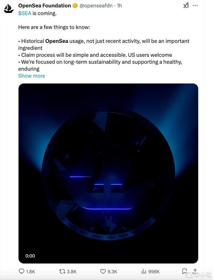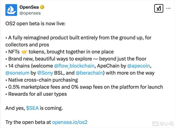 2 月 13 日晚间,OpenSea 在 X 上宣布推出 OS2 公测版本,并将推出平台代币 SEA,以及暗示将进行空投。尽管具体时间表和细节尚未公布,但此公告一出,无疑牵动了不少币圈老玩家的心,仅一小时,该推文的评论与转发数已突破千次,社区讨论热度飙升。