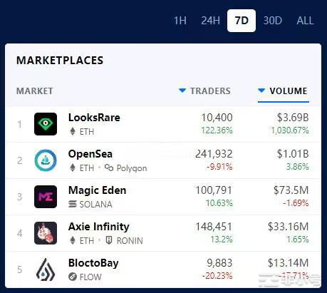2022 年 1 月 10 日,LooksRare 正式上线,团队表示只需要在 OpenSea 上交易量大于等于 3 ETH 的用户,在 LooksRare 上挂单一枚 NFT 即可获得空投,此外,用户可将获得的 LOOKS 空投质押来分享平台所有的交易费用。LooksRare 上线 2 日之后其单日交易量就超过了 OpenSea,而截止 2022 年 1 月 19 日的 7 日交易量数据上,LooksRare 是 OpenSea 的三倍有余。