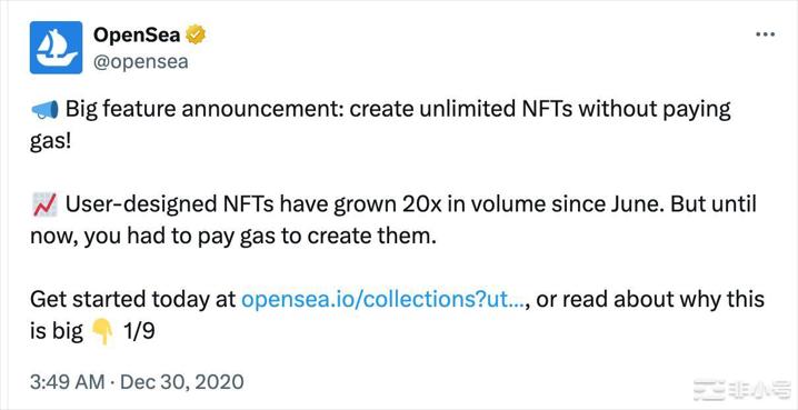 2020 年 12 月,OpenSea 上线新功能「Collection Manager」,用户无需手续费即可铸造 NFT(Gas 费由买家自行承担),官方还将这一功能称为「懒惰铸造(Lazy Minting)」,将链上发行与元数据分离,用户可以免费将商品的元数据上传至 OpenSea,而只有当商品第一次售出时才会被铸造为链上 ERC-1155 NFT。