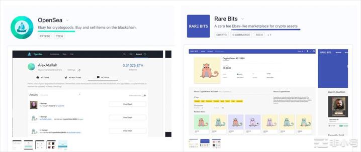尽管如此,Opensea 在当时也并非是独一无二的 NFT 交易平台。与其几乎同一天在 Product Hunt 上发布的,还有自称是「类似 eBay 的零费用加密资产市场」的 Rare Bits,一个比 OpenSea 更具优势的竞争对手, 有趣的是,OpenSea 同样将自己描述为「加密商品的 Ebay」。(Techub News 注,Ebay 是一个可让全球民众在网上买卖物品的线上拍卖及购物网站)