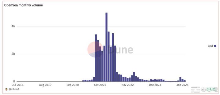 OpenSea 终于要发币了,如果放在三年前,这绝对会是一场万众期待的币圈狂欢,然而今时不同往日,如今的币圈已然是 MemeCoin 的天下,NFT 早已「过气」。更令人唏嘘的是,即便我们将关注点局限于 NFT 领域,OpenSea 也已经辉煌不在。据 Dune 数据显示,OpenSea 1 月交易量仅为 1.95 亿美元,较 2022 年初的 50 亿美元峰值暴跌 96%,年收入缩水至约 3326 万美元。