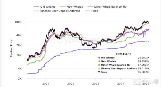 这里的“实际价格”是指一个链上指标,用于跟踪 BTC 网络上普通投资者的成本基础。当现货价格高于该指标时,意味着持有者整体处于盈利状态,而低于该指标则意味着亏损占主导地位。 从上图可以看出,比特币目前高于所有这些群体的实际价格,因此他们的成员都会获得一些未实现的收益。 从历史上看,这些群体的平均成本基础对加密货币具有一定意义。从图表中可以看出,只要价格高于新鲸鱼的实际价格(橙色),价格通常就会呈现看涨轨迹。 新鲸鱼,也称为短期持有鲸鱼,是指在过去 155 天内购买了比特币并持有超过 1,000 BTC 的 BTC 投资者。这群人目前的实际价格为 89,300 美元,这意味着如果熊市轨迹继续,BTC 可能在不久的将来面临重新测试它的风险。 不过,跌破这一水平并不意味着立即转向熊市;这只意味着比特币缺乏动力。BTC 可能必须避免跌破这一水平才能避免进入熊市状态,即矿工鲸鱼(绿色)。 矿工鲸鱼是指持有超过 1,000 BTC 的挖矿公司钱包 。CryptoQuant 创始人解释说,BTC 在过去几个周期中跌破这一关口都导致了熊市。