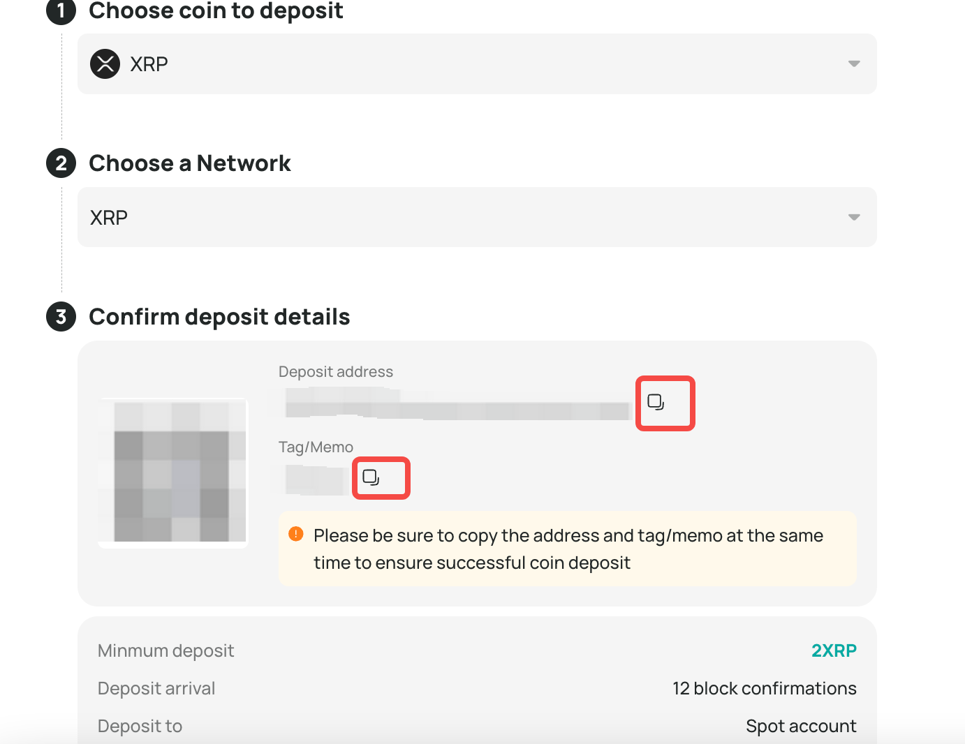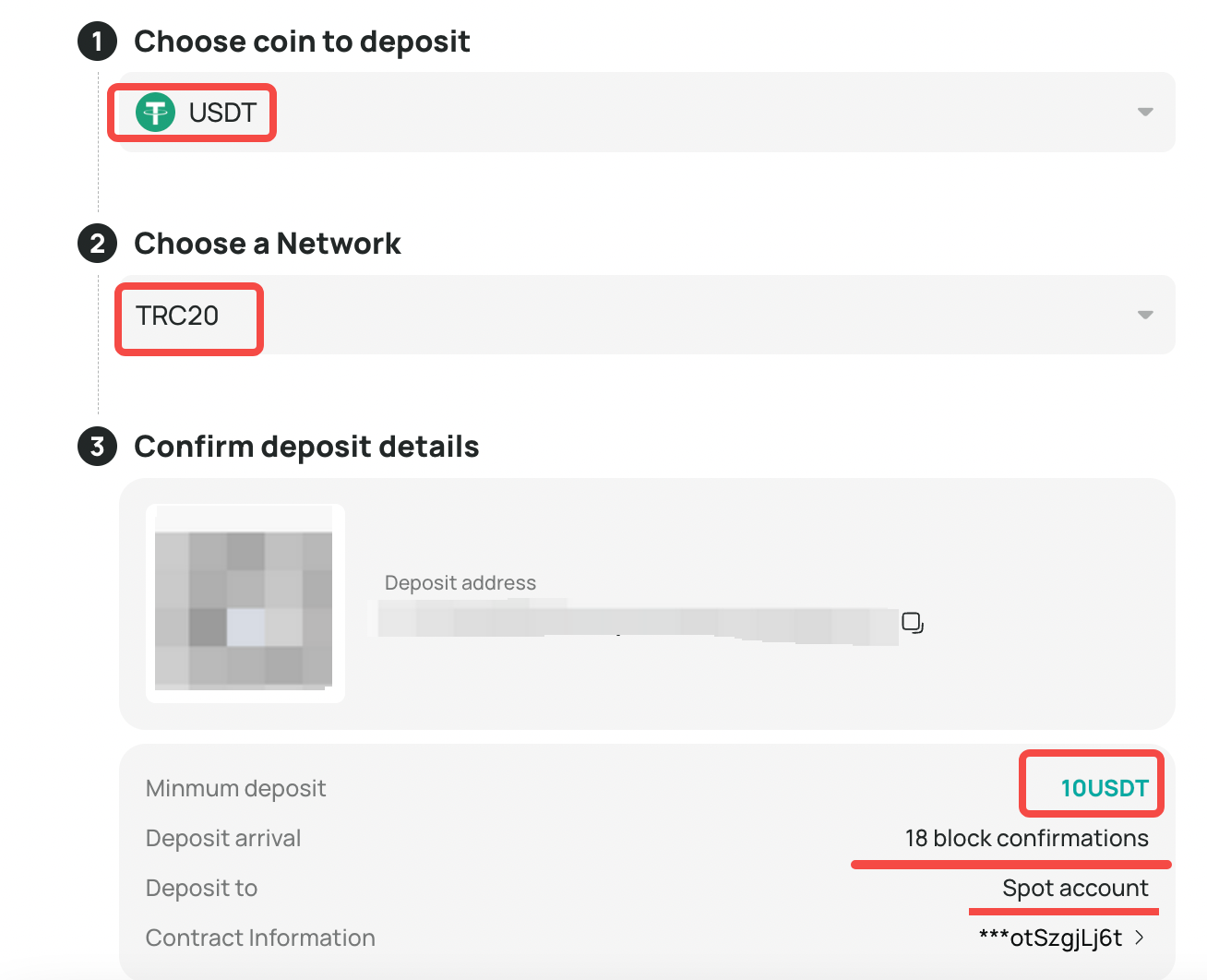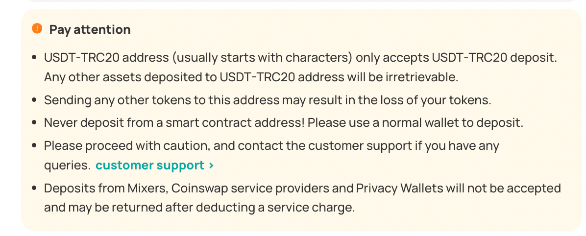 - Each token may have different deposit requirements, such as a minimum deposit amount or specific deposit instructions (e.g., tag/memo). Please carefully review the deposit notes on the deposit page before proceeding. For example, USDT-TRC20.