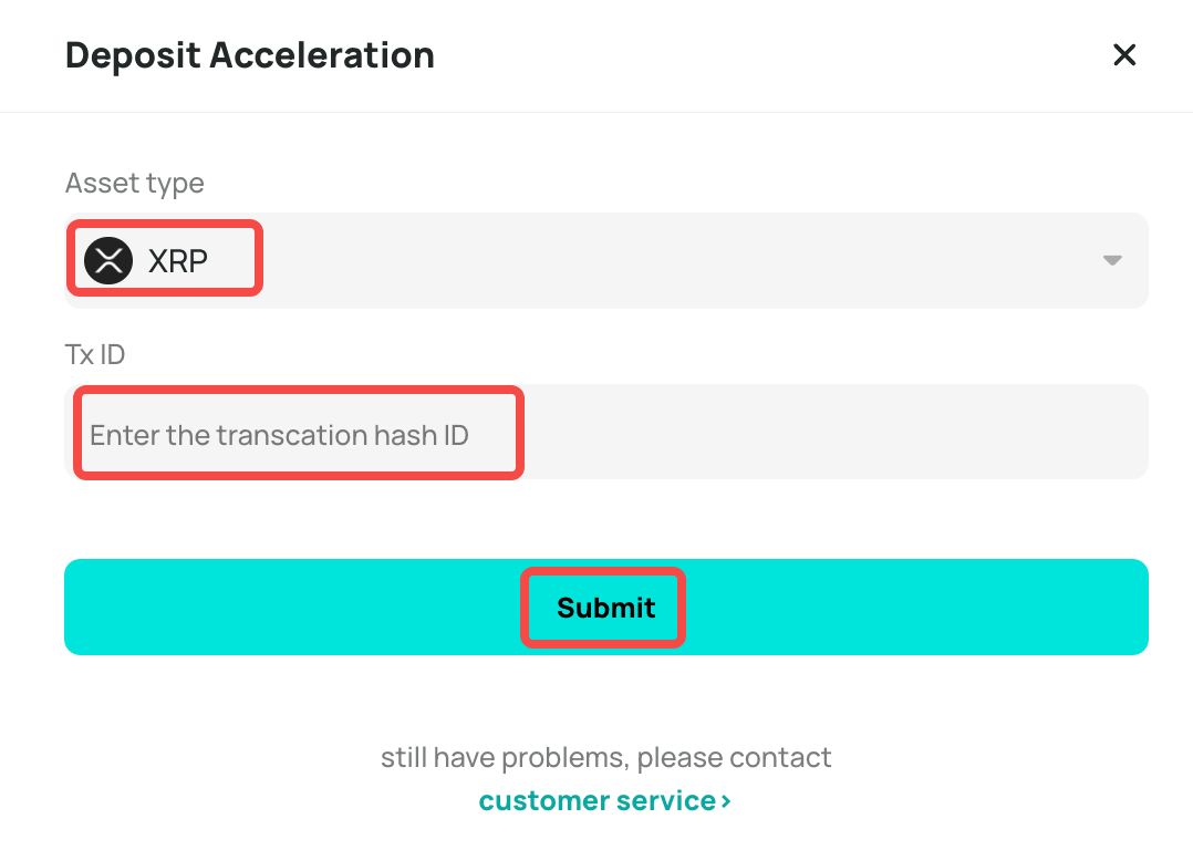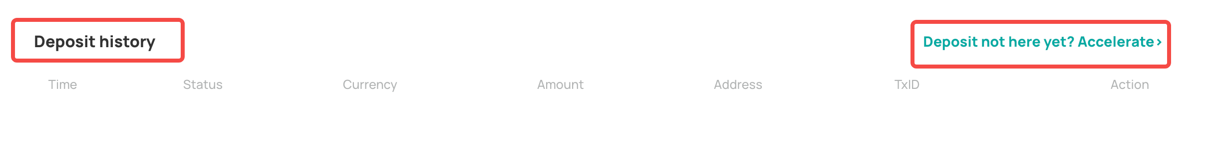 --> After the deposit is completed, you can return to the Deposit History section by scrolling down on the deposit page. If the deposit record is not visible, click the "Accelerate" button in the upper right corner, select the token, enter the Transaction Hash (TxID), and click "Confirm Submission". In most cases, the deposit will be credited within 2-3 minutes.