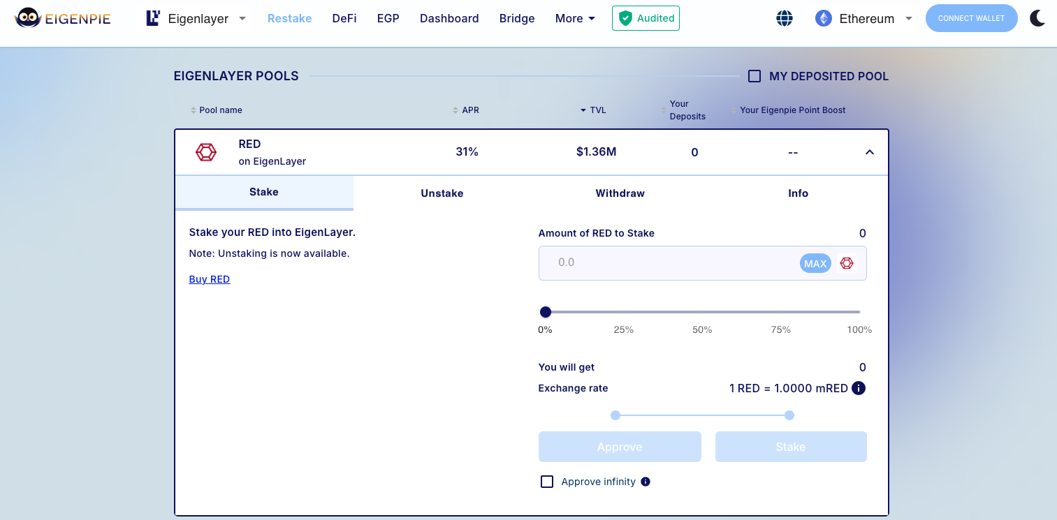 - - RED 代币与 EigenLayer 质押机制:RED 代币采用质押和惩罚机制确保网络安全,并结合 EigenLayer 质押增强安全性,吸引机构级用户。