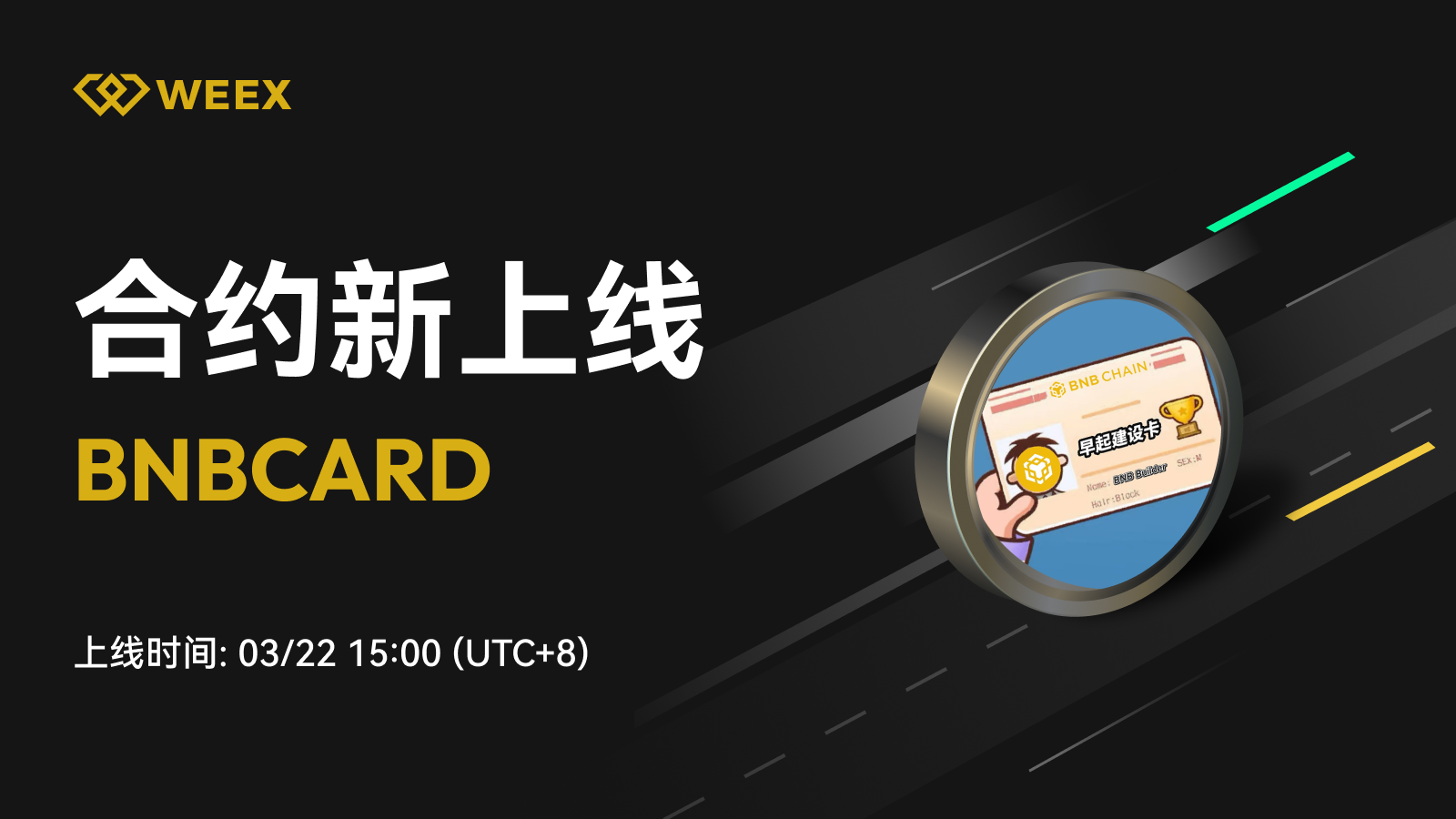 我们很高兴的宣布,WEEX合约将于2025年3月22日15:00 [UTC 8]上线BNBCARD U本位合约。