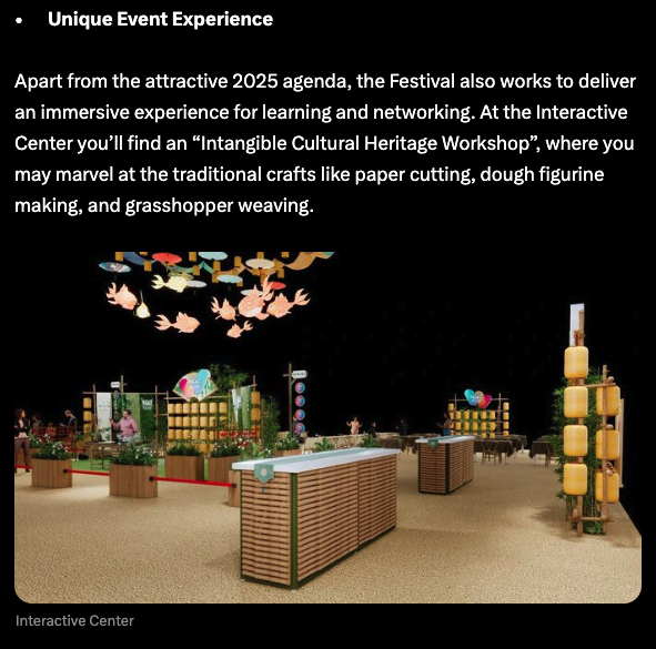 - - 沉浸式科技 文化体验:除了涵盖 DeFi、NFT、AI、安全等领域的高端论坛,活动还融合传统中华文化,设有互动工作坊、戏曲演出与 GameFi 电竞赛事,打造多维感官盛宴。
