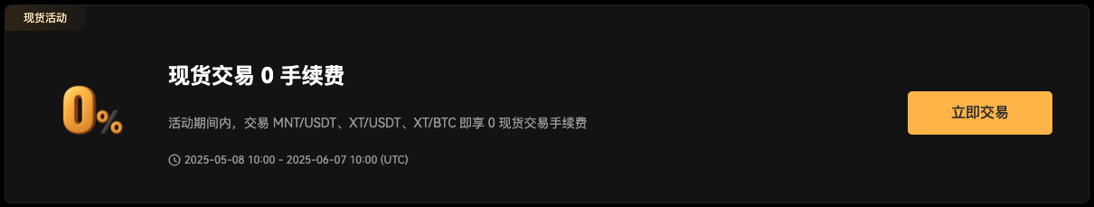 - 零手续费交易:5月8日至6月7日,所有MNT/USDT、XT/USDT和XT/BTC现货交易免除做市商和接受者手续费,最大化您的每一美元投资。