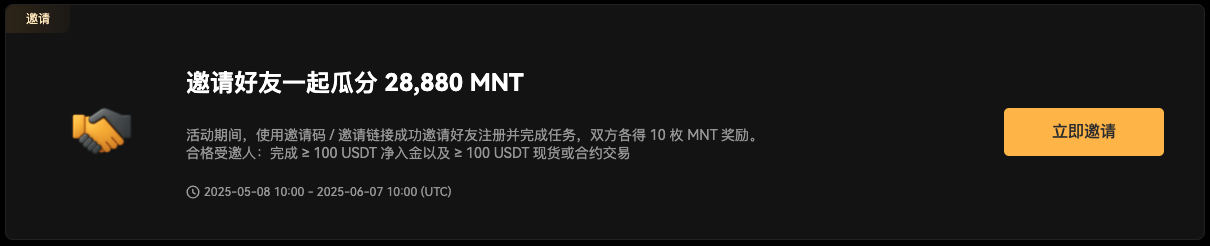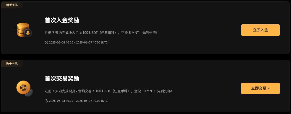 - 新用户奖励:新账户存款≥100 USDT可获5 MNT,交易≥100 USDT可获10 MNT,每成功推荐一人可获10 MNT(无上限)。