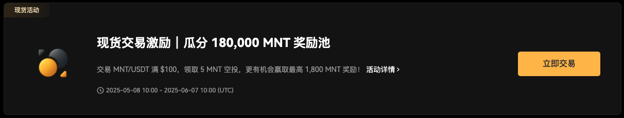 资格:MNT/USDT现货交易量≥100 USDT,可获得5 MNT(前3,000名用户)。