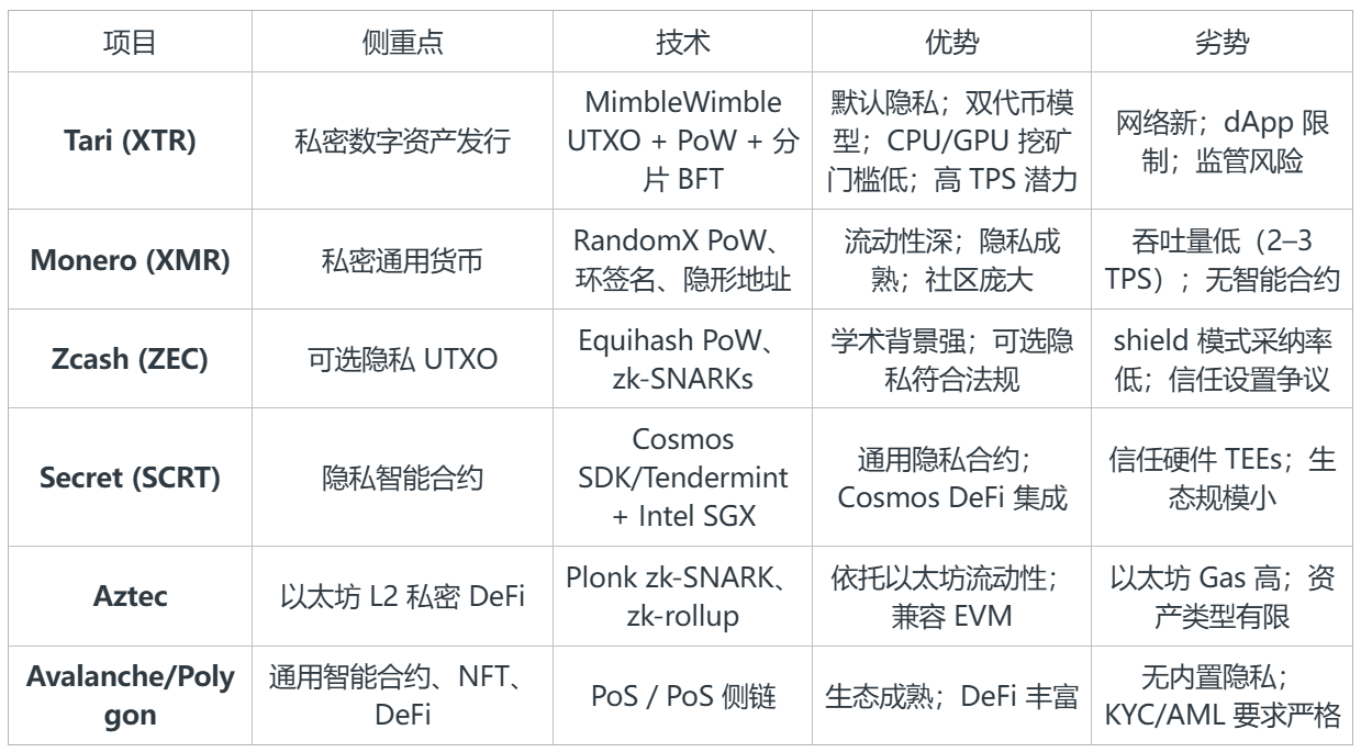 Tari 位于隐私币、数字资产发行和可编程区块链的交汇点,下面是它和主要竞争对手的对比: