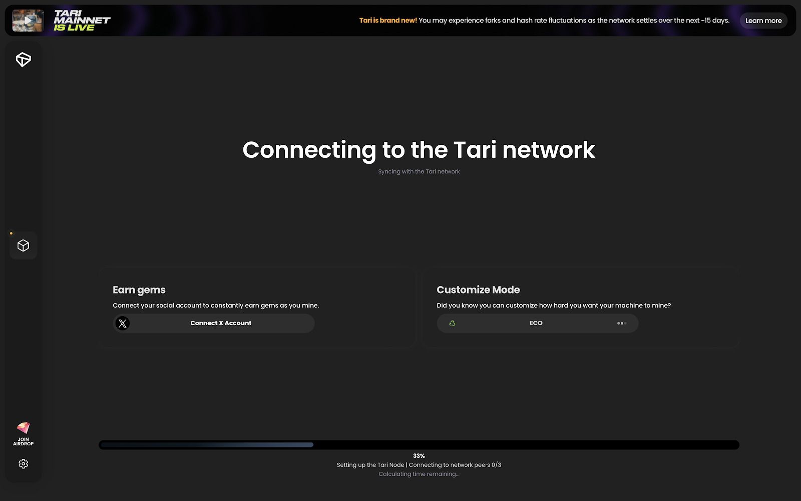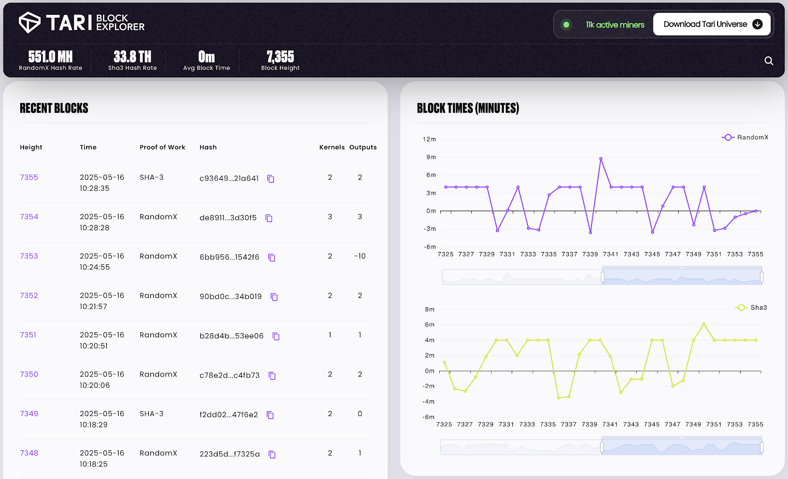 用户下载 Tari Universe 应用,通过 CPU/GPU 挖掘 XTM。可以与 Monero 的 RandomX 合并挖矿,也可单独使用 SHA3x。