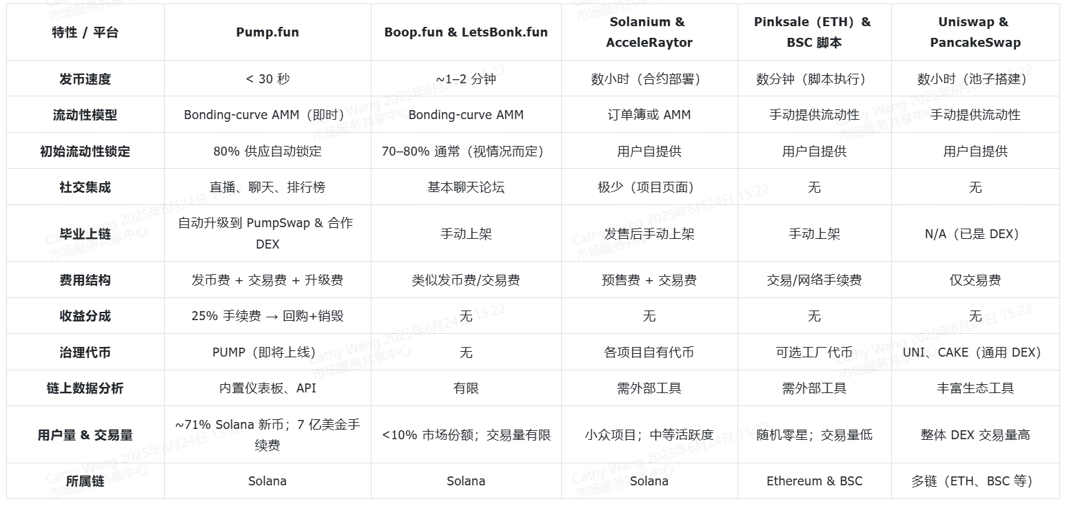 - 传统发币平台:Solanium 和 Raydium(RAY)的 AcceleRaytor 强调预售和项目审核,适合正规筹资,却缺乏 Pump.fun 那种即刻上线、随时交易的刺激感。
