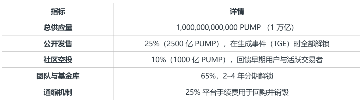 - - PUMP 代币总量 1 万亿,25% 用于 10 亿美元公募,10% 空投给社区,25% 平台手续费定期回购。