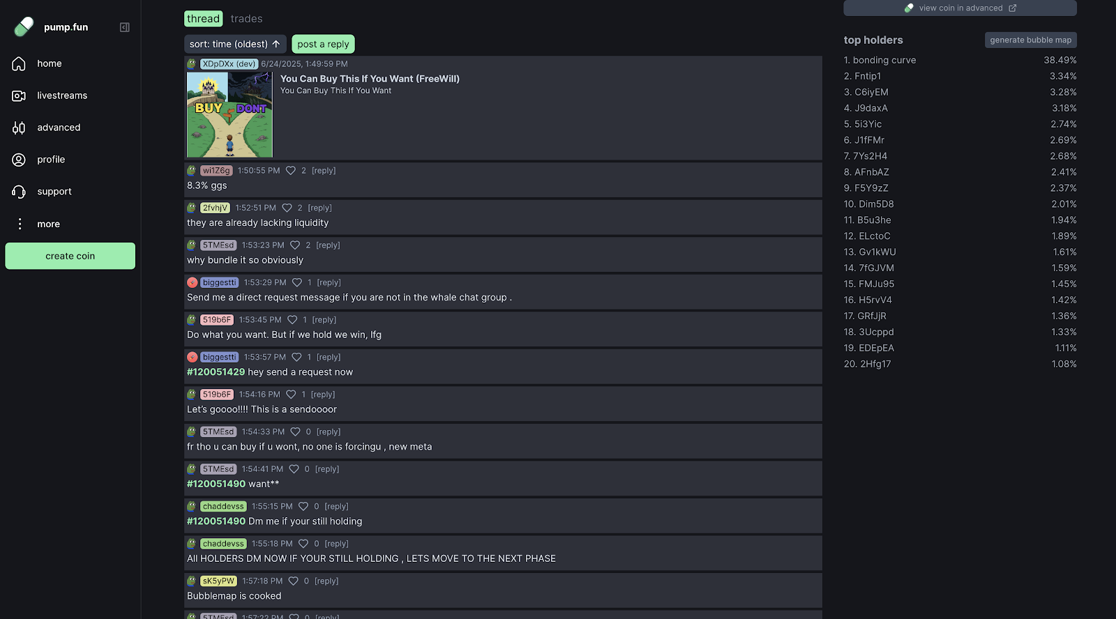 创币者可在 Pump.fun 内直接开直播,实时推介项目、答疑互动,并在屏幕上放置买入按钮。平台还有实时社交动态和排行榜,根据成交量、涨速和市值展示热门代币,就像24/7的线上游乐场。