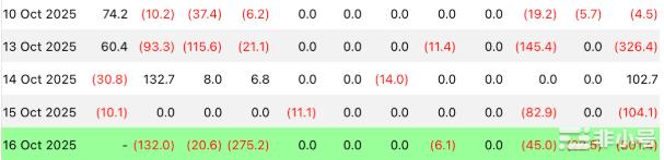 本週現貨比特幣 ETF 整體呈淨流出。四個交易日累計淨流出約 829 百萬美元,為近兩週最大撤出。10 月 16 日單日流出創階段新高,顯示短線機構防禦性轉強、情緒轉趨觀望。