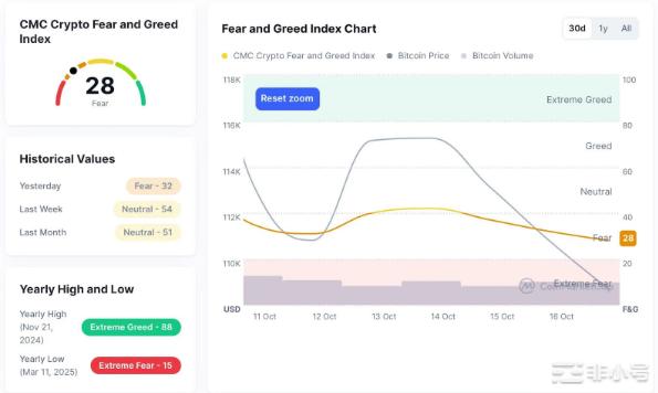 截至 10 月 17 日,恐懼與貪婪指數報 28,屬恐懼區,總體情緒偏謹慎與悲觀,風險偏好明顯下降、短線信心受壓。
