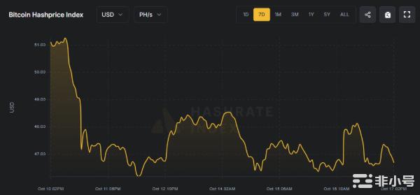 二次下壓回到 47.0 下方:中段回升後,於 10 月 14–16 日間多次低於 47.0。主因在於高位雜湊率基礎對較低的費用與價格形成壓力;網路持續高算力、難度滯後設計不變,等量雜湊競逐較少收入,使每 PH 收益再度被擠壓。