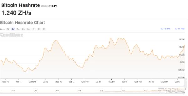 本週在 800 EH/s 至 1.3 ZH/s 刻度內,雜湊率經歷多次回落與再起,最終於區塊 919,471 收在 1.240 ZH/s。序列顯示艦隊具韌性、彈性高且電力管理紀律良好。對交易與風控而言,強勢的雜湊率收盤是安全性與市場結構的利多:降低礦工壓力尾部風險、支持穩定結算,並為價格在宏觀與流動性因素穩定後提供更堅實的修復環境。接下來關鍵在於雜湊率是否持續壓向週度上緣,及其是否轉化為更緊的難度環境與更穩定的出塊間隔。