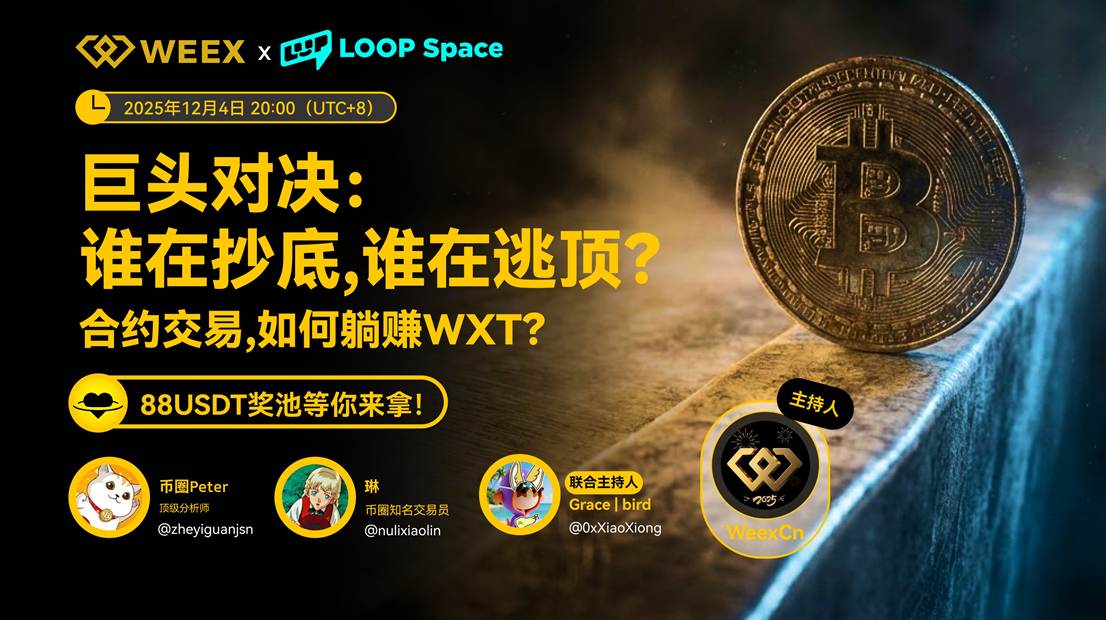近期加密行业再次迎来“巨头回归”式的讨论,包括 Meta、Amazon、富达甚至部分美资投行,都开始以更明确的动作参与数字资产与区块链场景,这在社区内部重新点燃了“机构牛市即将拉开序幕”的想象。但在 WEEX唯客12月4日最新一期「聪明交易员 · 巨头对决:谁在抄底,谁在逃顶?合约交易,如何躺赚 $WXT ?」Twitter Space 现场,来自机构侧和交易侧的嘉宾都表达了相当一致的观点:巨头入场本身并不等于牛市,真正影响市场方向的变量依旧是现金、利率与宏观流动性的分配方式。