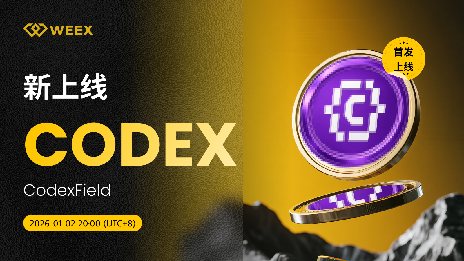 CodexField (CODEX) 现已上线WEEX! Weex 2026年01月02日 12:01 微信扫一扫分享到朋友或朋友圈 尊敬的WEEX用户:CODEX/USDT交易对正式上线WEEX。具体安排如下:充值:即将开放交易:2026年01月02日20:00(UTC 8)正式开放提现:即将开放立即交易:CODEX/USDT CodexField (CODEX) 更多信息:CODEX代币源于Twitter社区关于闪亮岩石的搞笑推文,背景是网友们分享发现神秘金色宝藏的 meme 故事。 官网X账号交易手续费
