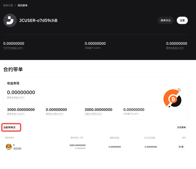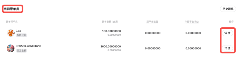 - 通过「当前带单员」能够实时了解正在跟随的交易员相关订单动态。具体可查看「交易员标识」(如头像、昵称)、获取「跟单模式」、以及 「跟单总收益」 等内容,点击「详细」可查看更多交易员「当前跟单」明细,方便跟踪合作交易员的实时表现。