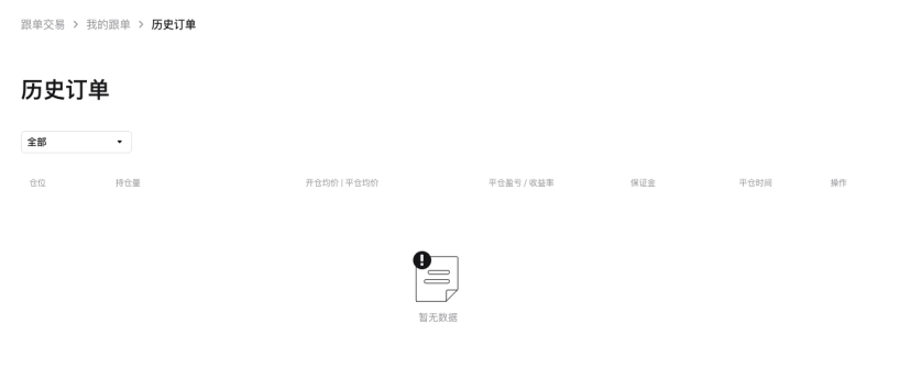 - 通过「历史跟单」查阅过往所有跟单订单的详细仓位信息。针对每一笔历史跟单,都能精准查看「仓位」方向、具体「持仓量」、「开仓均价|平仓均价」,以及订单了结后的「平仓盈亏|收益率」等数据,为复盘跟单策略、优化后续投资提供详实依据。
