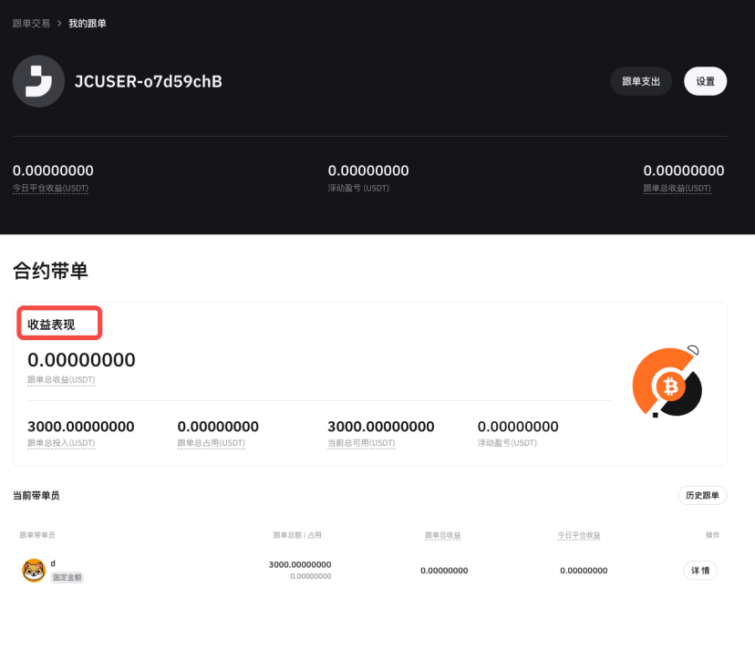 - 前往「我的跟单」,通过「收益表现」可清晰查看核心收益数据,具体涵盖「跟单总收益」、「跟单总投入」、「浮动盈亏」以及跟单金额总占比等关键信息,全面掌握跟单投资的收益全貌。
