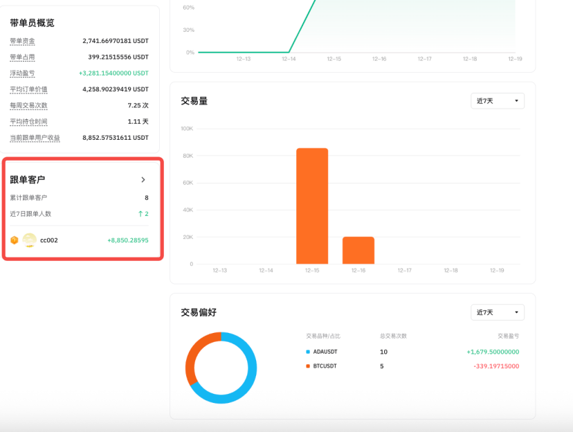 - 带单占用:带单员因交易而被占用的资金量,体现当前资金占用情况。