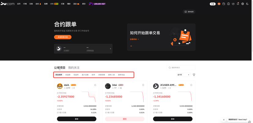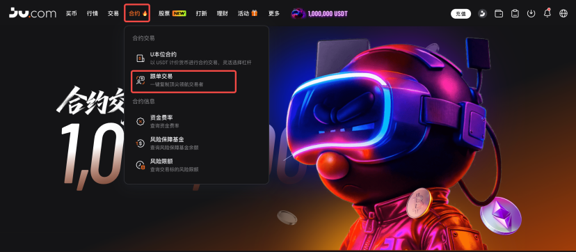 - 访问Ju.com 官网找到主菜单的「合约」,选择「跟单交易」。