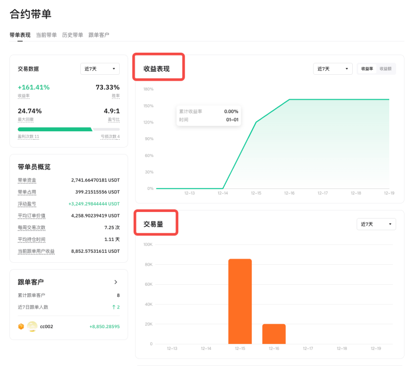- 收益率:收益率 = 当前收益率 历史收益率,核心业绩指标,直观呈现带单累计盈利水平。