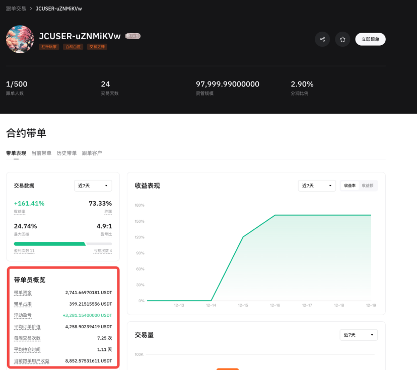 - 平均订单价值:带单员的平均交易订单价值,衡量单次交易资金投入规模。
