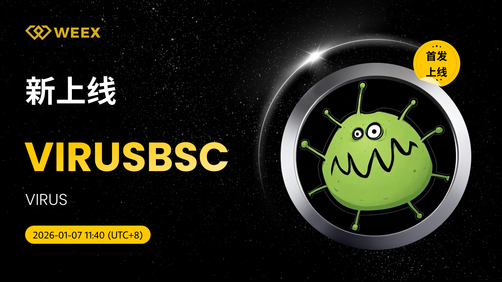 VIRUS (VIRUSBSC) 现已上线WEEX! Weex 2026年01月07日 03:42 微信扫一扫分享到朋友或朋友圈 尊敬的WEEX用户:VIRUSBSC/USDT交易对正式上线WEEX。具体安排如下:充值:即将开放交易:2026年01月07日11:40(UTC 8)正式开放提现:即将开放立即交易:VIRUSBSC/USDT VIRUS (VIRUSBSC) 更多信息:VIRUS代币源于@bsc_virus的推文,关于病毒在BSC链上疯狂传播的meme事件。 X账号交易手续费