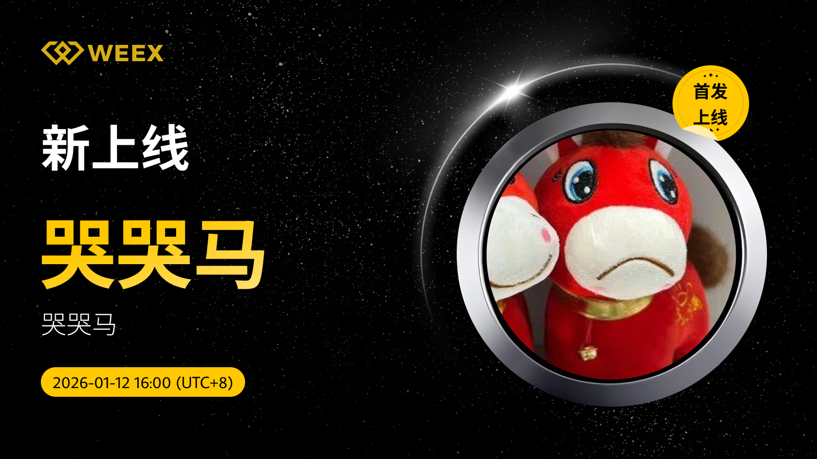 哭哭马 (哭哭马) 现已上线WEEX! Weex 2026年01月12日 07:58 微信扫一扫分享到朋友或朋友圈 尊敬的WEEX用户:哭哭马/USDT交易对正式上线WEEX。具体安排如下:充值:即将开放交易:2026年01月12日16:00(UTC 8)正式开放提现:即将开放立即交易:哭哭马/USDT 哭哭马 (哭哭马) 更多信息:哭哭马代币源于jianke_bsc的推文,关于错版马的搞笑事件报道。背景为一个意外印错的马图案引发网络热议。 X accountTrading fees