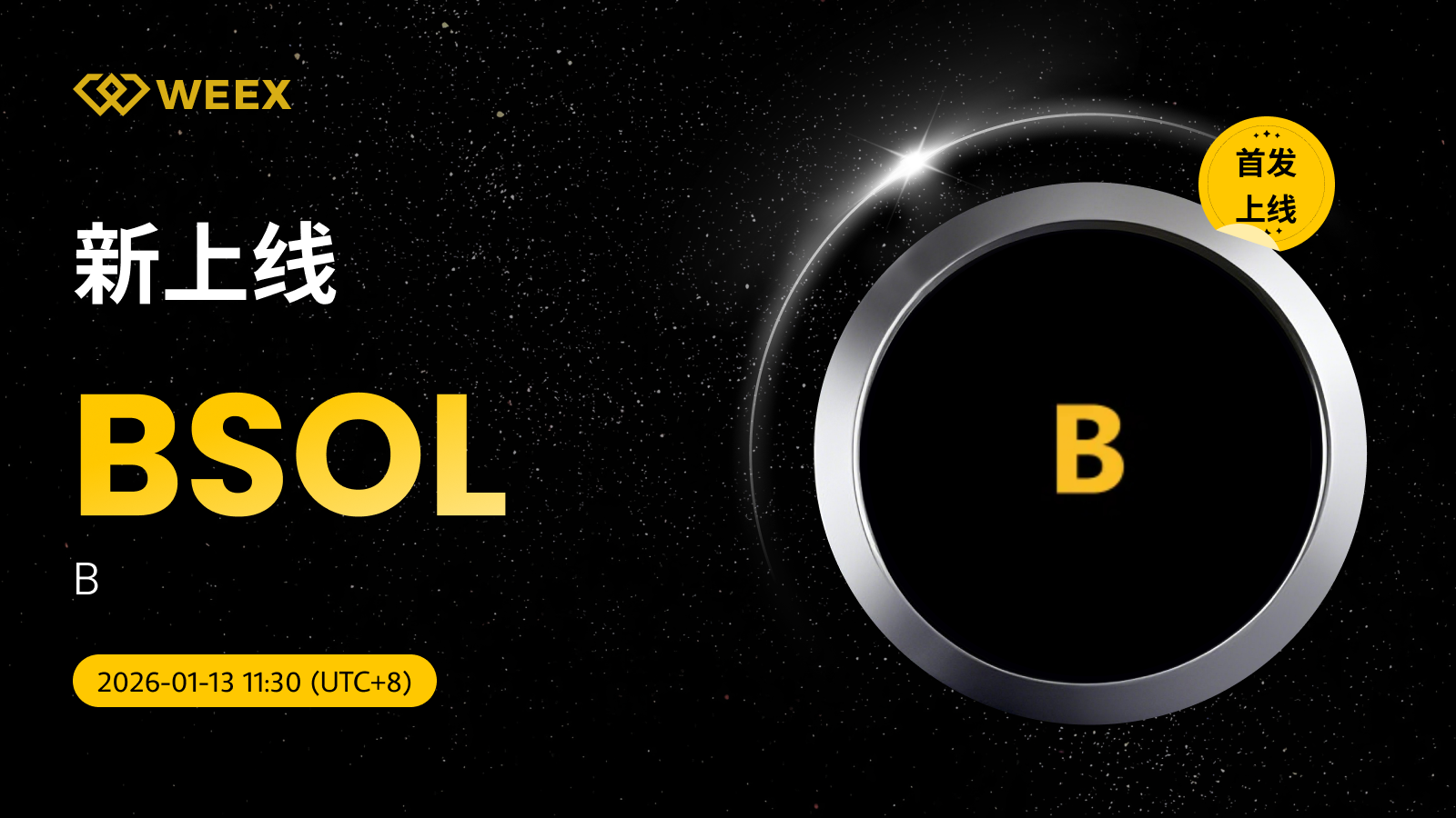 B (BSOL) 现已上线WEEX! Weex 2026年01月13日 03:35 微信扫一扫分享到朋友或朋友圈 尊敬的WEEX用户:BSOL/USDT交易对正式上线WEEX。具体安排如下:充值:即将开放交易:2026年01月13日11:30(UTC 8)正式开放提现:即将开放立即交易:BSOL/USDT B (BSOL) 更多信息:$B 在 BONK 上。 X accountTrading fees