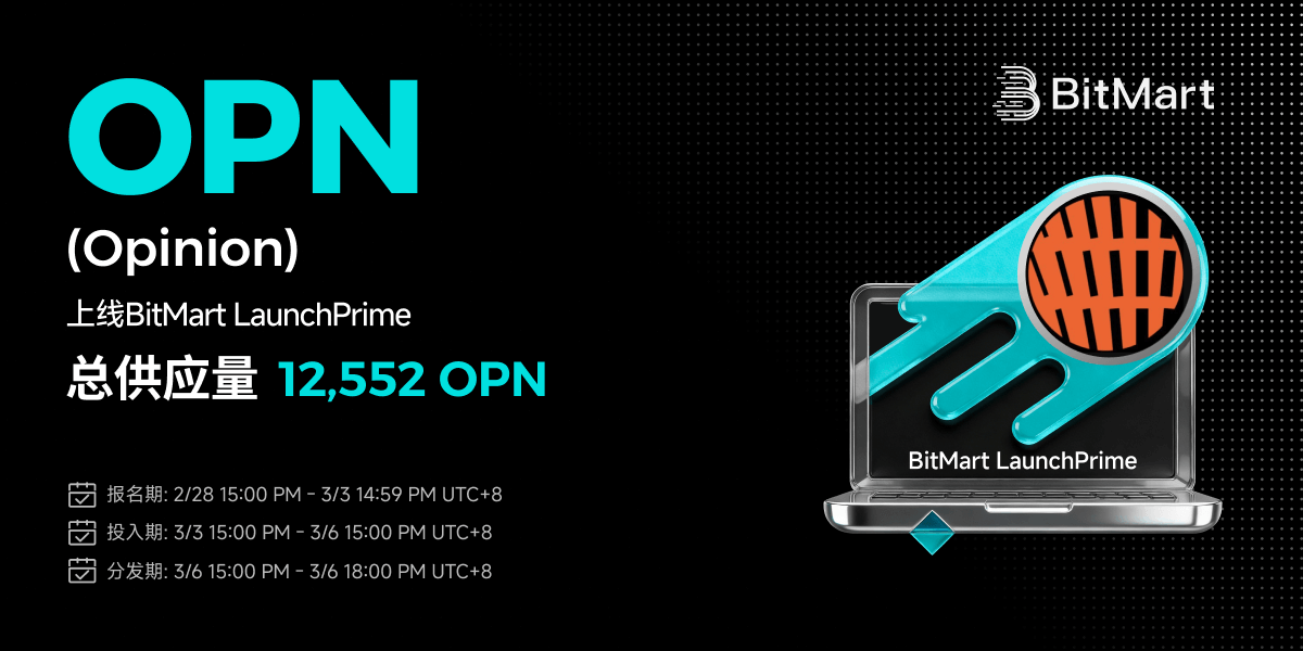 BitMart将于2026年2月28日推出Opinion (OPN)限时认购活动,您可以通过BitMart LaunchPrime参与并获得门票,赢得本次独家限时认购的机会。