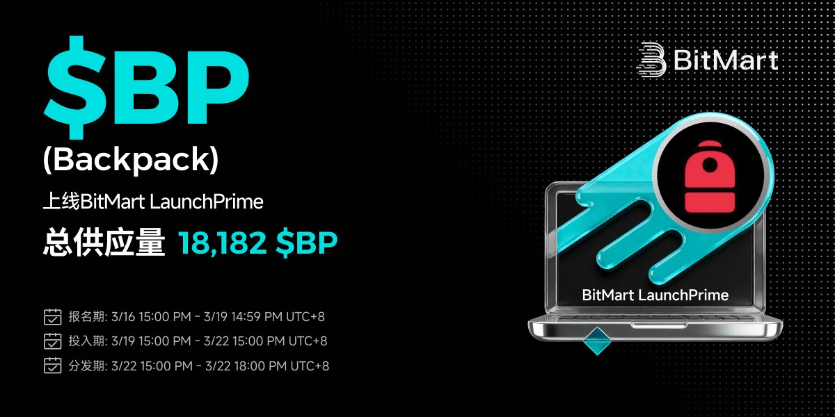 BitMart将于2026年3月16日推出Backpack ($BP)限时认购活动,您可以通过BitMart LaunchPrime参与并获得门票,赢得本次独家限时认购的机会。