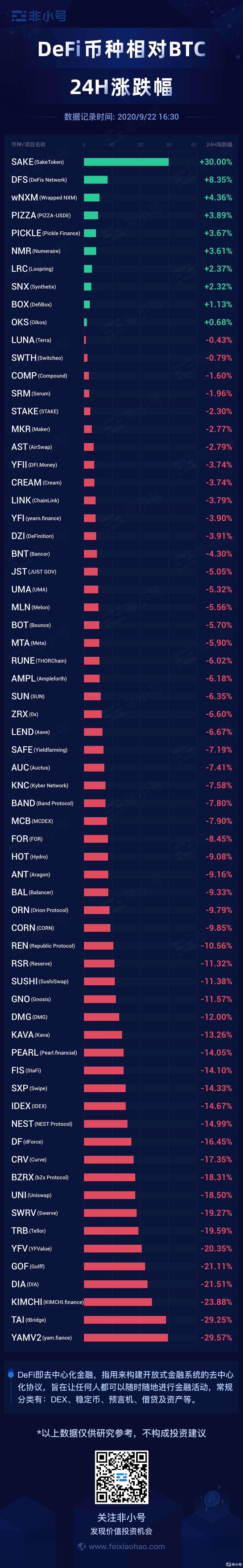 DeFi 币种相对BTC价格 近24H涨跌榜,出炉! 非小号官方 2020年09月22日 11:55 微信扫一扫分享到朋友或朋友圈 以下涨跌幅计算公式是:(该币种当前时点相对于BTC的价格-该币种24H前时点相对于BTC的价格)/ 该币种24H前时点相对BTC的价格。
