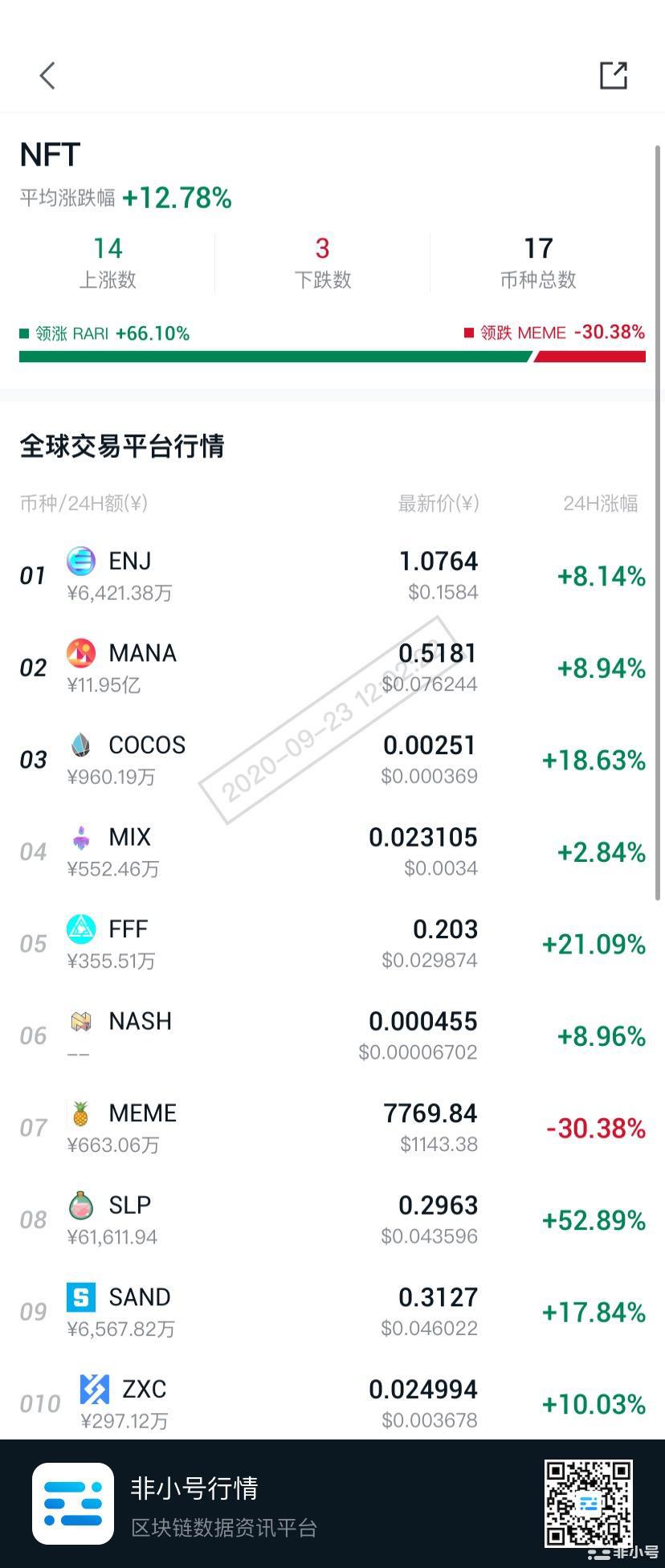 NFT板块最全币种榜单,14上涨,3下跌 非小号官方 2020年09月23日 04:07 微信扫一扫分享到朋友或朋友圈 今日币圈最靓的仔——NFT,平均涨幅+12.98%,RARI最高涨幅66.47%。了解所有NFT币种,打开APP行情-概念涨跌-NFT>>