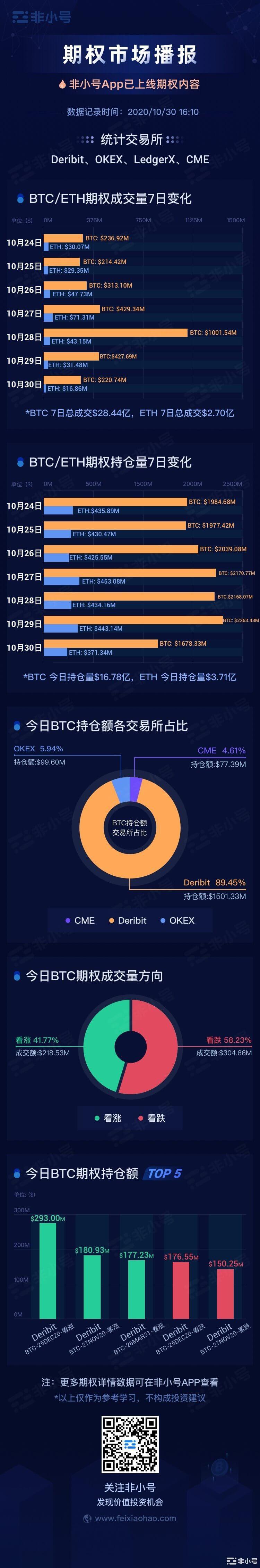 【本周期权数据播报】出炉了! 非小号官方 2020年10月30日 10:10 微信扫一扫分享到朋友或朋友圈 BTC期权:7日总成交$28.44亿,其中10月28日BTC下跌,当日期权成交量达$10亿;截止至今日16:10,BTC期权持仓总量达$16.78亿,其中,Deribit占比89.45%,持仓量达$15亿; ETH期权:7日总成交$2.70亿,截止至今日16:10,持仓额达$3.71亿。 期权数据涵盖交易所有:Deribit、OKEX、LedgerX、CME。
