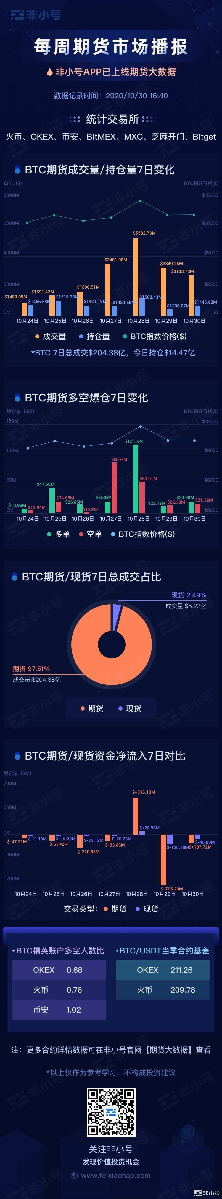 BTC期货7日总成交$204.38亿,环比增长38%,今日持仓量达$14.47亿;7日多单总爆仓$2.97亿,环比增长494%;7日空单总爆仓$2.38亿,环比下降33%。其中,多单爆仓主要集中在10月28日,爆仓量达$1.21亿,当日BTC下跌至13070附近,振幅达800美元。