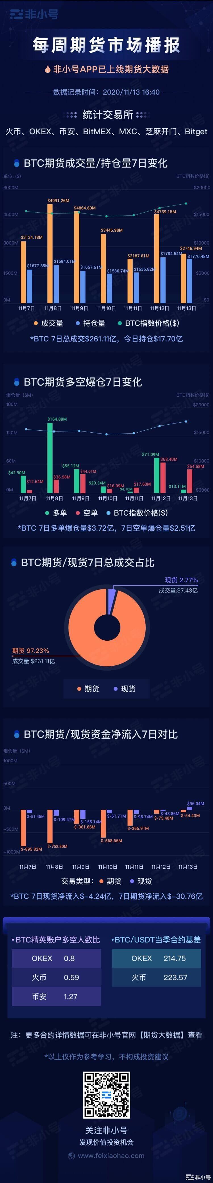 BTC期货7日总成交$261.11亿,环比增长2.72%,截止至今日持仓量达$17.7亿;近7日多单总爆仓$3.72亿,环比增长47%;7日空单总爆仓$2.51亿,环比下降55%。其中,多单爆仓主要集中在11月8日,爆仓量达$1.65亿。