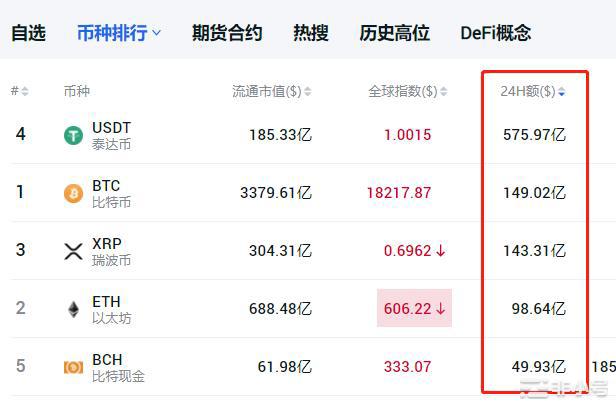 24H成交额排行前五的币种:USDT、BTC、XRP、ETH、BCH 非小号官方 2020年11月24日 06:21 微信扫一扫分享到朋友或朋友圈 根据非小号行情数据显示,近24H成交额排行前五的币种分别是USDT 575.97亿、BTC 149.02亿、XRP 143.31亿、ETH 98.64亿、BCH 49.93亿。除USDT为稳定币代表资金进出外,其他主流币种在今天都有不错的涨幅,更多涨幅数据请在APP内查看。