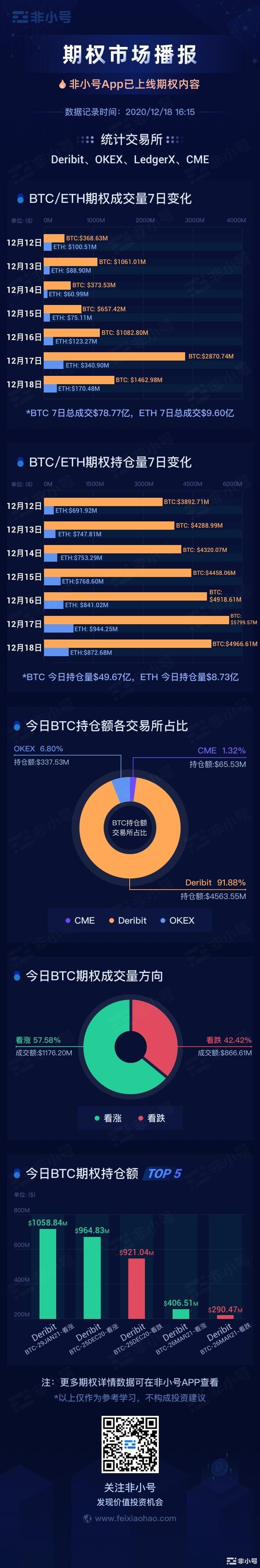 BTC期权:7日总成交$78.77亿,本周单日成交量最高发生在12月17日,当日BTC现货井喷式拉升,价格从当日低点$20550拉升至$23850最高点,当日期权成交量达$28.7亿;截止至今日16:10,BTC期权持仓总量达$49.67亿,其中,Deribit占比91.88%,持仓量达$45.64亿。