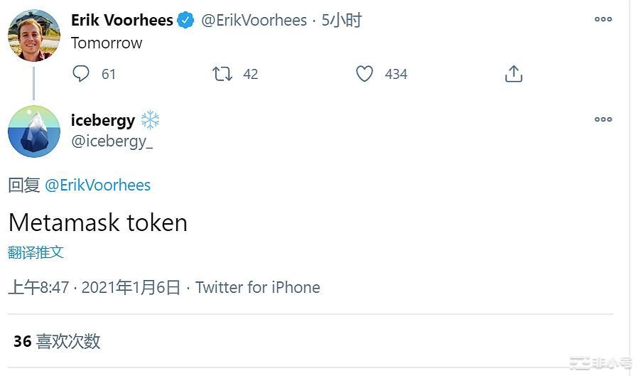 【热点】MetaMask疑似将发币 非小号官方 2021年01月06日 06:17 微信扫一扫分享到朋友或朋友圈 MetaMask官方推特今日发布视频再次介绍MetaMask Swaps,称其是交换以太坊代币最简单的方法。同时,Shapeshift首席执行官Erik Voorhees在推特发布“明天”,网友猜测MetaMask Swaps明天或发行代币。
