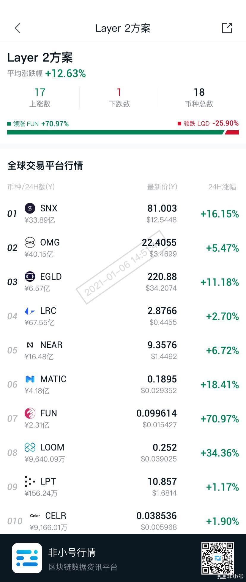 Layer2概念板块今日平均涨幅为12.84% 非小号官方 2021年01月06日 06:52 微信扫一扫分享到朋友或朋友圈 非小号板块行情显示,Layer2 概念板块今日平均涨幅为12.84%。18个币种中17个上涨,1个下跌,其中领涨币种为:FUN(+68.33%)、LOOM(+33.32%)、SKL(+33.32%)。查看板块所有币种涨幅,打开APP-行情-概念涨跌-Layer2方案。