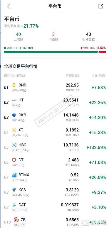 平台币 概念板块今日平均跌幅为 21.77% 非小号官方 2021年02月20日 06:08 微信扫一扫分享到朋友或朋友圈 非小号行情显示,平台币 概念板块今日平均跌幅为 21.77%。43个币种中40个上涨,3个下跌。想全部平台币涨跌幅,点击非小号APP首页-概念涨跌-平台币。