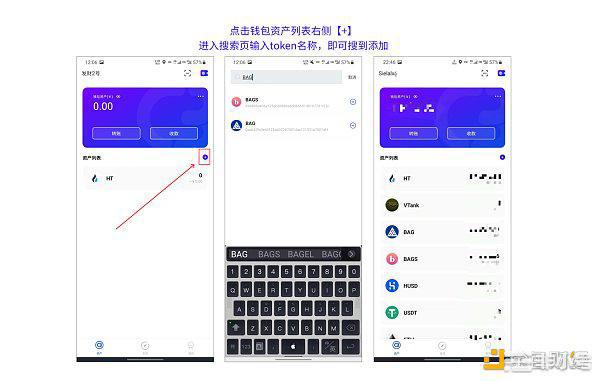 4、添加想要的代币,点击资产列表右侧【+】进入搜索页,即可添加到资产列表